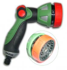 Пистолет - наконечник 7 - ми позиционный поливочный SKRAB 28283 имеет семь фиксированных режимов полива, есть плавная регулировка напора воды, два режима работы курка, с фиксацией и без фиксации. Корпус пистолета металлический, противоударный. Защитное резиновое кольцо на "голове" пистолета служит дополнительной защитой от удара. Имеется штуцер для быстросъемной муфты.