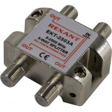 Телевизионный делитель/сплиттер с выходами под F-разъемы предназначен для разделения сигнала на 3 части, актуален в многокомнатных квартирах. Полоса пропускания от 5 до 2500 МГц - для спутникового телевидения. Устройство обеспечит просмотр ТВ без помех с сохранением качества сигнала.