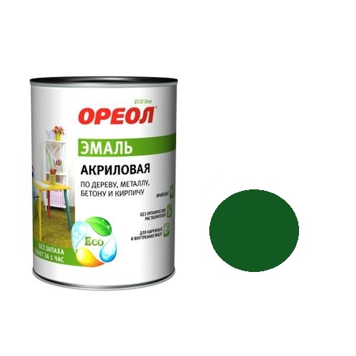 Эмаль акриловая универсальная Ореол, глянцевая зеленая 0,9 л применяется для окрашивания деревянных, металлических, минеральных (бетон, кирпич, черепица) поверхностей снаружи и внутри помещений, кроме пола, также возможно нанесение на ранее окрашенные, в том числе алкидными лакокрасочными материалами, поверхности. Может применяться для окрашивания цокольных этажей, крыш с минеральными покрытиями. Перед нанесением эмали на металл необходимо предварительно грунтование поверхности. Эмаль в соответствии с техническими и технологическими характеристиками рекомендуется к применению в детских комнатах, дошкольных, школьных, лебечно-профилактических учреждениях и предприятиях общественного питания.