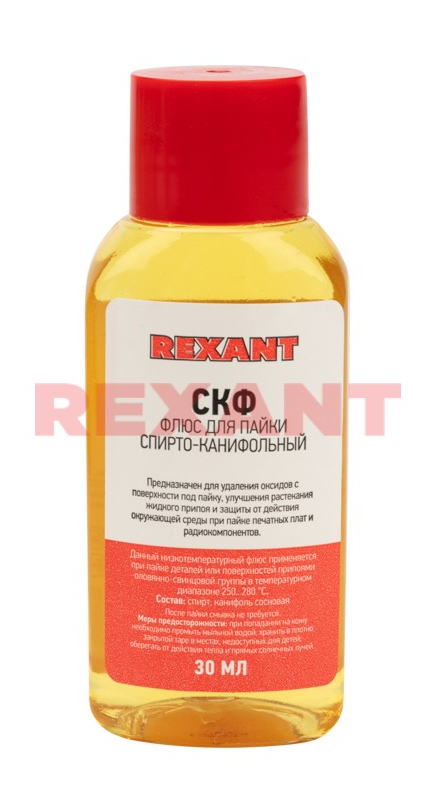 Флюс для пайки СКФ спирто-канифольный 30 мл REXANT предназначен для удаления оксидов с поверхности под пайку, улучшения растекания жидкого припоя и защиты от действия окружающей среды при пайке печатных плат и радиокомпонентов. Данный низкотемпературный флюс применяется при пайке деталей или поверхностей припоями оловянно-свинцовой группы в температурном диапазоне 250...280 °С. После пайки смывка не требуется.
