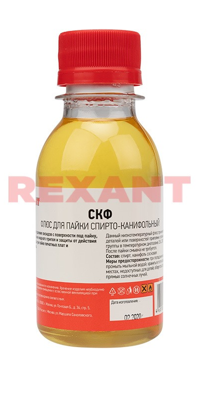 Флюс для пайки СКФ 100мл (спирто-канифольный) REXANT предназначен для удаления оксидов с поверхности под пайку, улучшения растекания жидкого припоя и защиты от действия окружающей среды при пайке печатных плат и радиокомпонентов. Данный низкотемпературный флюс применяется при пайке деталей или поверхностей припоями оловянно-свинцовой группы в температурном диапазоне 250-280?. После пайки смывка не требуется. Крышка-кисточка позволит наносить дозированное количество флюса на участки пайки.