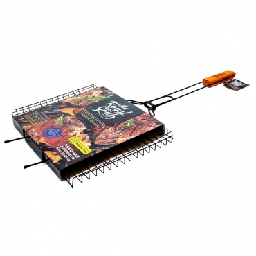 Решетка-гриль RoyalGrill изготовлена из высококачественной стали с антипригарным покрытием. На решетке удобно размещать стейки, ребрышки, гамбургеры, сосиски, рыбу, овощи. Решетка предназначена для приготовления пищи на углях. Блюда получаются сочными, ароматными, с аппетитной специфической корочкой. Рукоятка изделия оснащена деревянной вставкой и фиксирующей скобой, которая зажимает створки решетки.