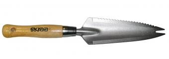Нож - совок для удаления сорняков 335 мм с деревянной ручкой CrMo SKRAB 28080 выполнен из хроммолибденовой стали, имеет антикоррозийное покрытие, шкалу глубины 150 мм, удобную деревянную ручку. Ручка покрыта лаком для защиты от грязи и воды. Нож садовый 28080 SKRAB очень простое и удобное в работе приспособление, которое помогает садоводу легко избавиться от нежелательных сорняков, в том числе одуванчиков, на грядке, клумбе, цветнике без трудоёмкого перекапывания земли.