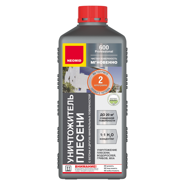 NEOMID 600 мгновенно удаляет серый налет, эффективно и быстро уничтожает грибы, мхи, лишайники, водоросли, бактерии с бетона, кирпича, камня и других минеральных поверхностей.