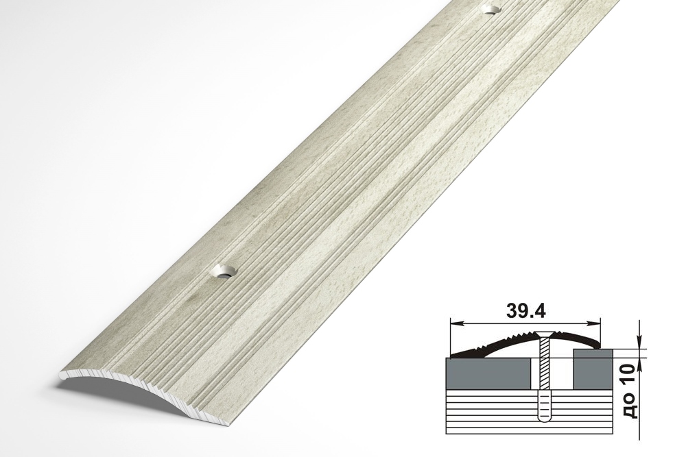 В пороге есть отверстия для удобного монтажа, противоскользящие насечки, не подвергается коррозии. Каждый профиль поставляется в индивидуальной упаковке, оснащенной пластиковым европодвесом, в комплекте с саморезами и дюбелями.