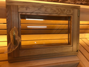 Окно для бани и сауны из термолипы со стеклопакетом (бронза или прозрачный, одинарный), в комплекте петли и ручка.