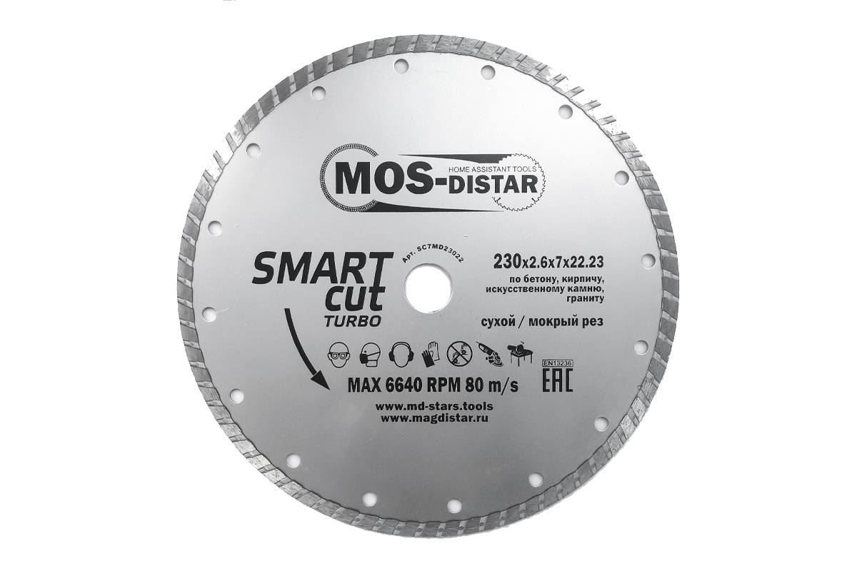 Диск алмазный TURBO SMART CUT или УМНЫЙ РЕЗ 230х2,6х7х22,23 от MOS-DISTAR – турбированный диск, обрабатывающий бетон, кирпич или гранит. В нем отлично сочетается скорость и надежность работы, так как технологическая особенность корпуса позволяет проходить тяжелые элементы материала (такие как арматура в бетоне) без риска повреждения алмазного слоя. Эта особенность выгодно отличает турбированные диски от сегментных.