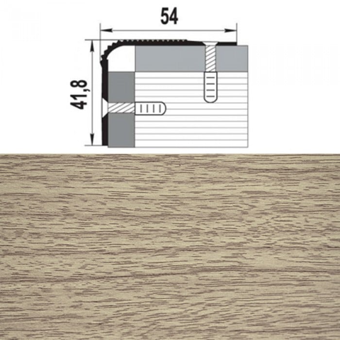 Угловой профиль из алюминия служит для защиты углов и ступеней лестницы. Длина 900мм. Размер горизонтальной стороны 54мм. Вертикальной 41,8мм.