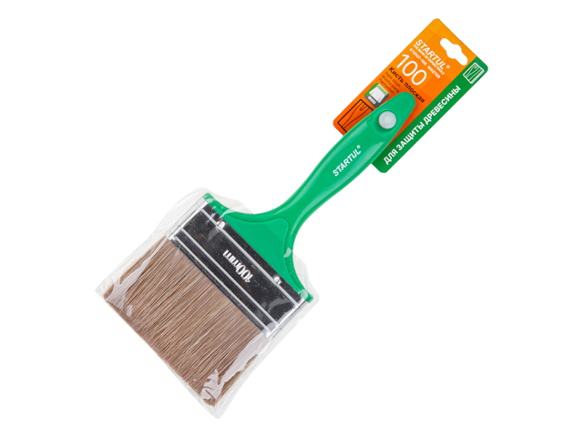 Технические характеристики: Тип и назначение: кисть плоская для выполнения различных внутренних и наружных малярных работ на плоских поверхностях. Специальный микс для средств деревозащиты, лазурей,пропиток, антисептиков, грунтовок, а также для ЛКМ на водной основе; Тип щетины: смешанная из светлой натуральной и темной синтетической щетины, топс 70%; Бандаж: металлический с антикоррозийной обработкой; Рукоять: зеленая пластмассовая с отверстием для подвеса; Длина рабочей части, дюйм/мм: 4 (100 мм); Рабочая высота щетины, мм: 57; Толщина кисти, мм: 17