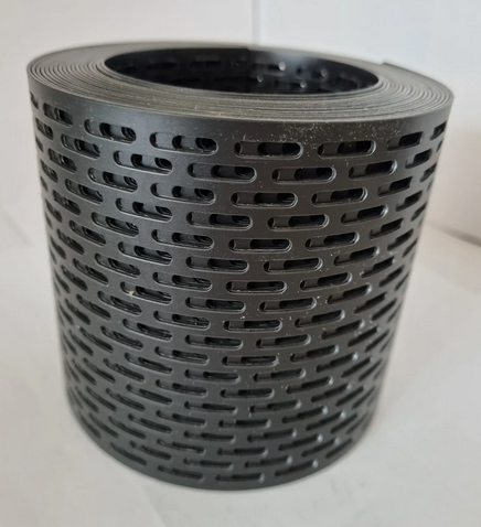 Вентиляционная лента для карнизного свеса представляет собой пластиковую ленту шириной 100 мм и длиной 5 м, имеющую овальные сетчатые отверстия для обеспечения свободного протока воздуха в подкровельное пространство. Общая площадь вентиляционных отверстий составляет 486 см2 на 1 п.м