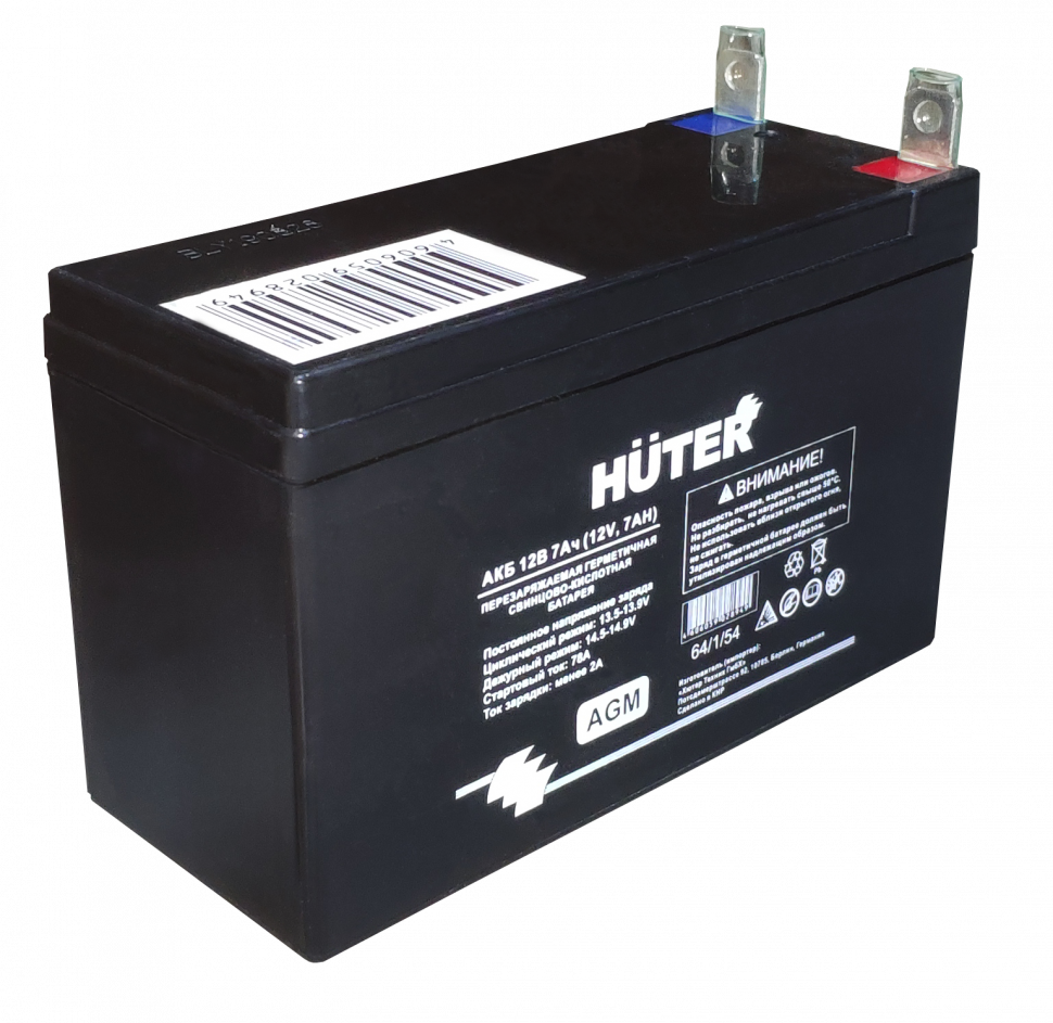 Аккумуляторные батареи свинцово-кислотные, герметичные. Предназначены для запуска бензиновых электрогенераторов, оснащённых электрическим стартером. Могут применяться, так же, и для другой бензиновой техники со схожими техническими параметрами. Аккумуляторы HUTER изготовлены при помощи технологии AGM (Absorbent Glass Mat). Отличие батарей AGM от классических в том, что в них содержится абсорбированный электролит, а не жидкий, что даёт ряд преимуществ в свойствах аккумулятора: