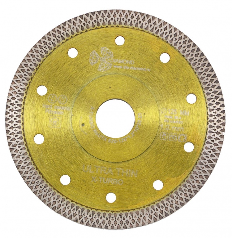 Алмазный диск Trio Diamond Ultra Thin X-Turbo 125 мм - изготавливается методом горячего прессования. Диск используется резки армированного бетона, кирпича, бордюрного камня, железобетона и твердой керамики. Толщина алмазного слоя 1,2 мм, а высота 10 мм. Посадочное отверстие - 22,23 мм. Рифленые сегменты режущей кромки обеспечивают высокую скорость реза, а перфорация корпуса способствует дополнительному охлаждению диска. Диск подходит для работы на УШМ.