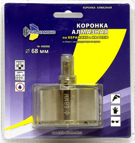 Алмазная коронка Trio Diamond по керамике и стеклу 68 мм - с центрирующим сверлом, изготовлена методом вакуумной пайки. Диаметр коронки 68 мм. Используется для сверления кафеля, керамики и стекла. Коронка имеет цилиндрический хвостовик. Встроенное центрирующее сверло способствует точному позиционированию при выполнении работ. Посадочное отверстие - 10 мм. Максимальная глубина сверления - 30 мм. При эксплуатации инструмента в зону реза должна подаваться вода. Применяется для работы на сверлильных устройствах.