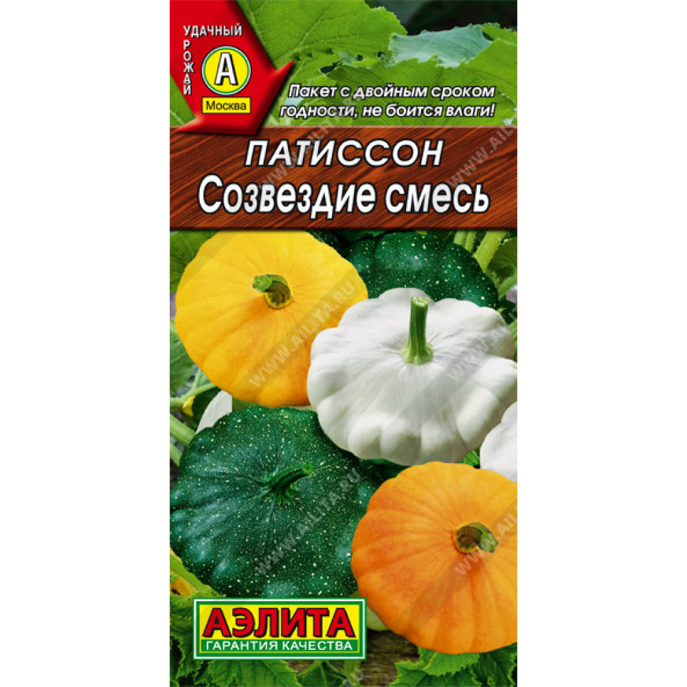 Смесь ранних кустовых патиссонов. Содержит 35% семян сорта Сомбреро® (белоплодный), 35% семян сорта Карапуз® (желтоплодный) и 30% семян зеленоплодного сорта Сынишка®. От всходов до начала плодоношения 42-54 дня. Масса плода в биологической спелости 0,4-0,5 кг. В кулинарии используют молодые трех-пятидневные завязи ? 5-7 см. Такие плоды идеально подхо-дят для цельноплодного маринования.