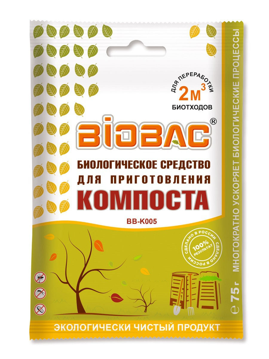 Биологическое средство для приготовления компоста (порошок), 75гр Предназначено для переработки 2куб.м. биоотходов. Благодаря комплексу микроэлементов, активным природным ферментам и высокой концентрации микроорганизмов, многократно ускоряет биологические процессы, максимально эффективно разлагает органические вещества и, за счет насыщения биомассы полезными бактериями, делает конечный продукт, готовый компост, более ценным органическим удобрением. Наличие в препарате аэробных и анаэробных микроорганизмов делает препарат универсальным для применения как в компостных контейнерах, так и на открытом грунте. Устраняет неприятные запахи разложения биомассы Увеличивает концентрацию полезных почвенных бактерий в готовом удобрении Уничтожает семена сорняков Препятствует развитию личинок насекомых Уменьшает объем биомассы. Обеззараживает биоотходы.