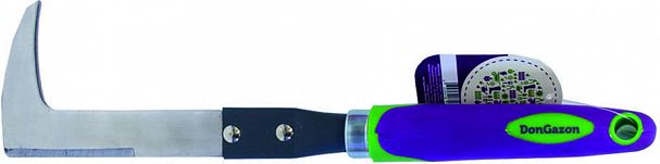 Нож для травы имеет стальное нержавеющее лезвие особой формы, и обрезиненную ручку.