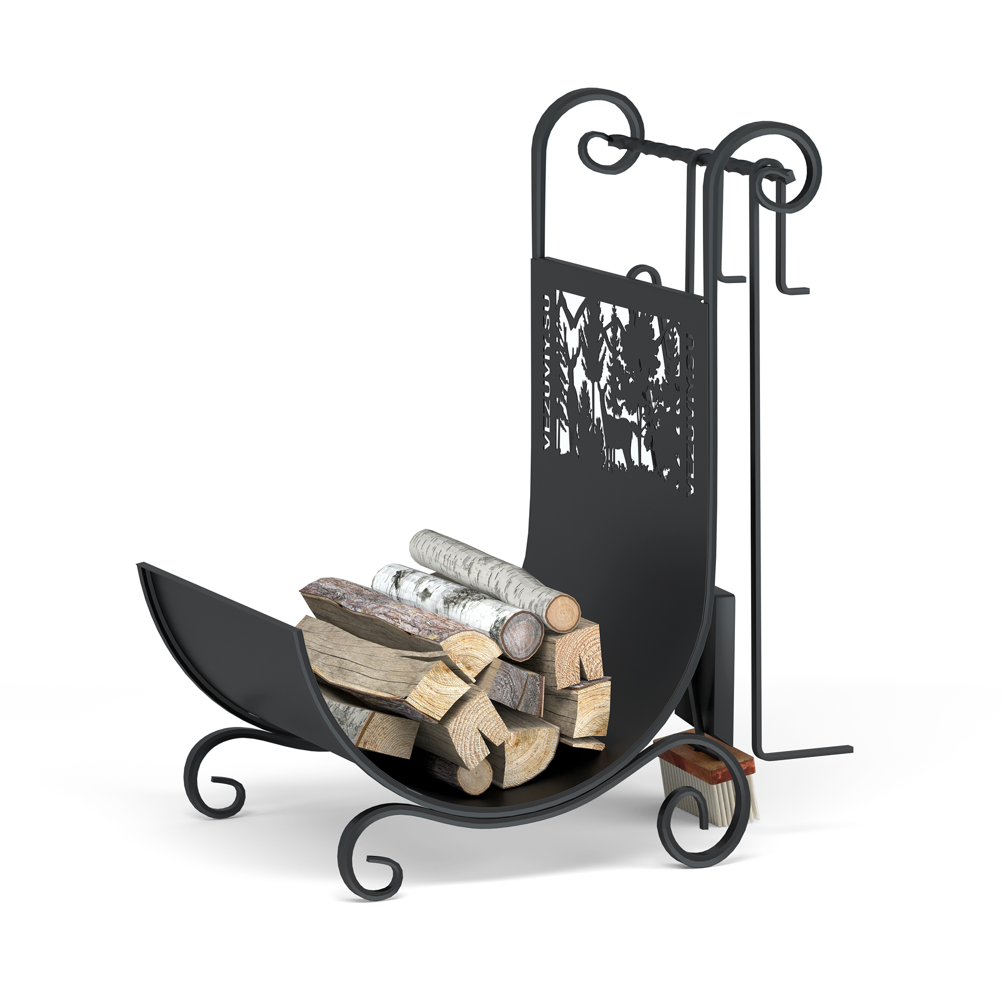 В комплект входят: дровница, кочерга, совок и щётка для ухода за печью, камином или костровой чашей.