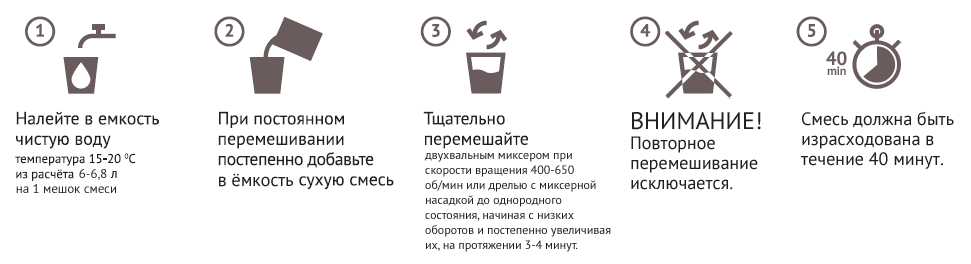 Для достижения требуемой консистенции, необходимо добавлять количество воды, указанное на мешке.