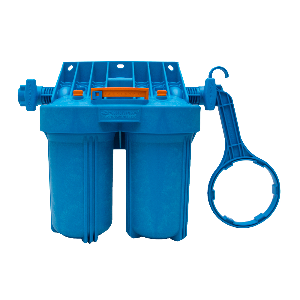 Двойная колба фильтра (магистральный) предназначен для очистки холодной воды в бытовых условиях от механических частиц (ржавчины, песка, ила и др.), а также хлорорганических соединений, нефтепродуктов, пестицидов, тяжёлых металлов, растворённого железа и иных органических и неорганических веществ (в зависимости от модификации и установленных картриджей для очистки воды). С тыльным/торцевым подключением колб