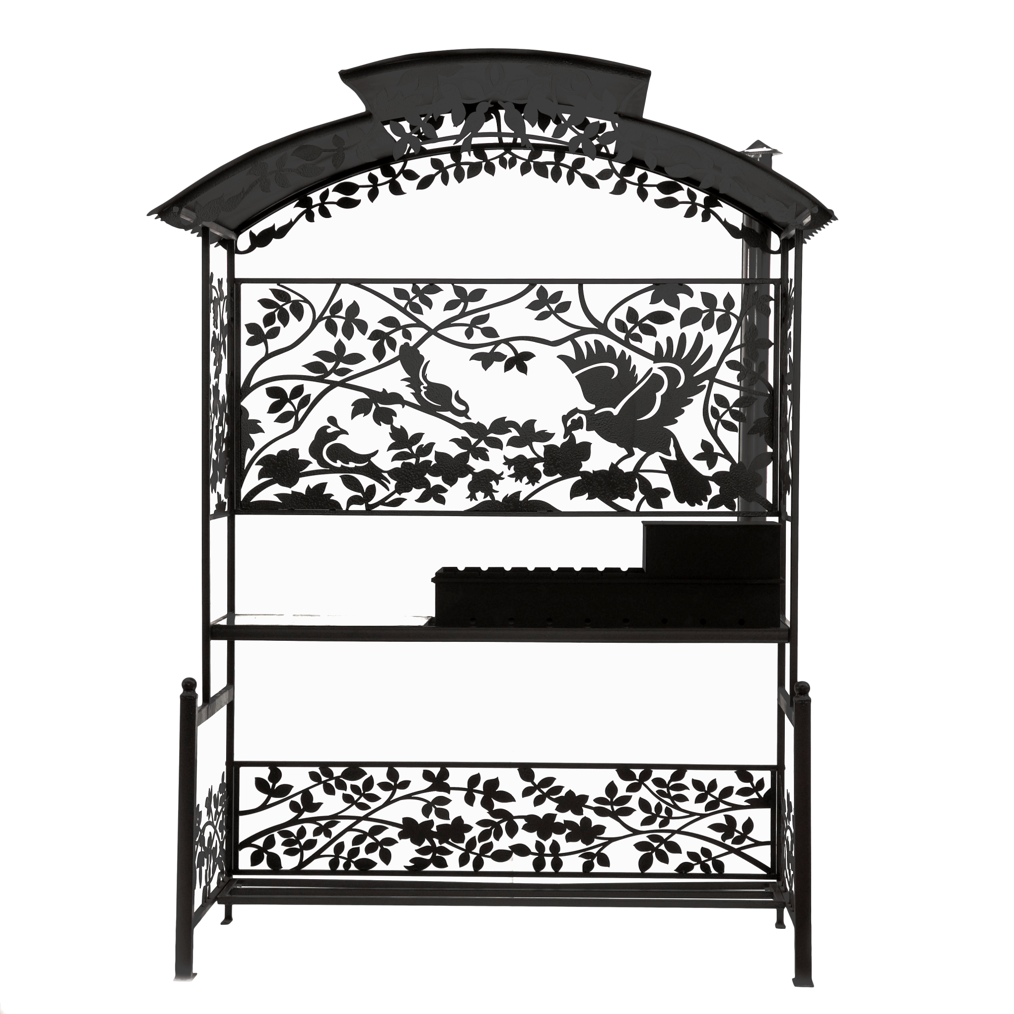 Мангал Птицы М90К (с печью под казан) - это металлический разборный мангал с крышей, с резными рисунками в виде птиц в шиповнике. Один из самых красивых и популярных мангалов, предлагаемых нашим производством. Каркас мангала выполнен из стальных труб 20х20 мм, а столешница из 20х40 мм.