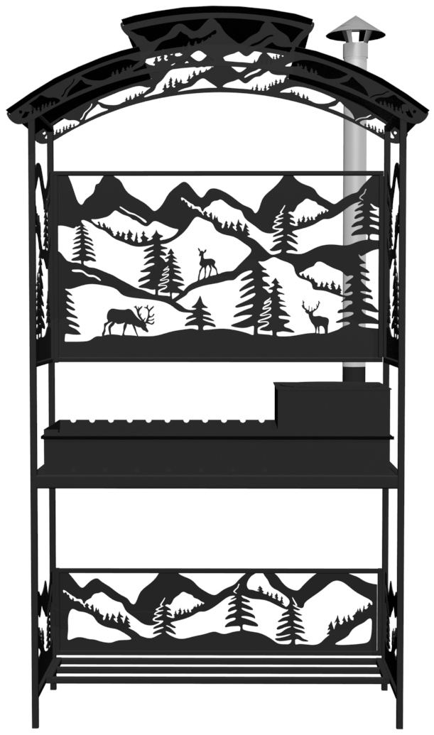 Мангал Олени Лайт Казан - металлический разборный мангал среднего размера с крышей и резными рисунками в виде оленей в лесу.