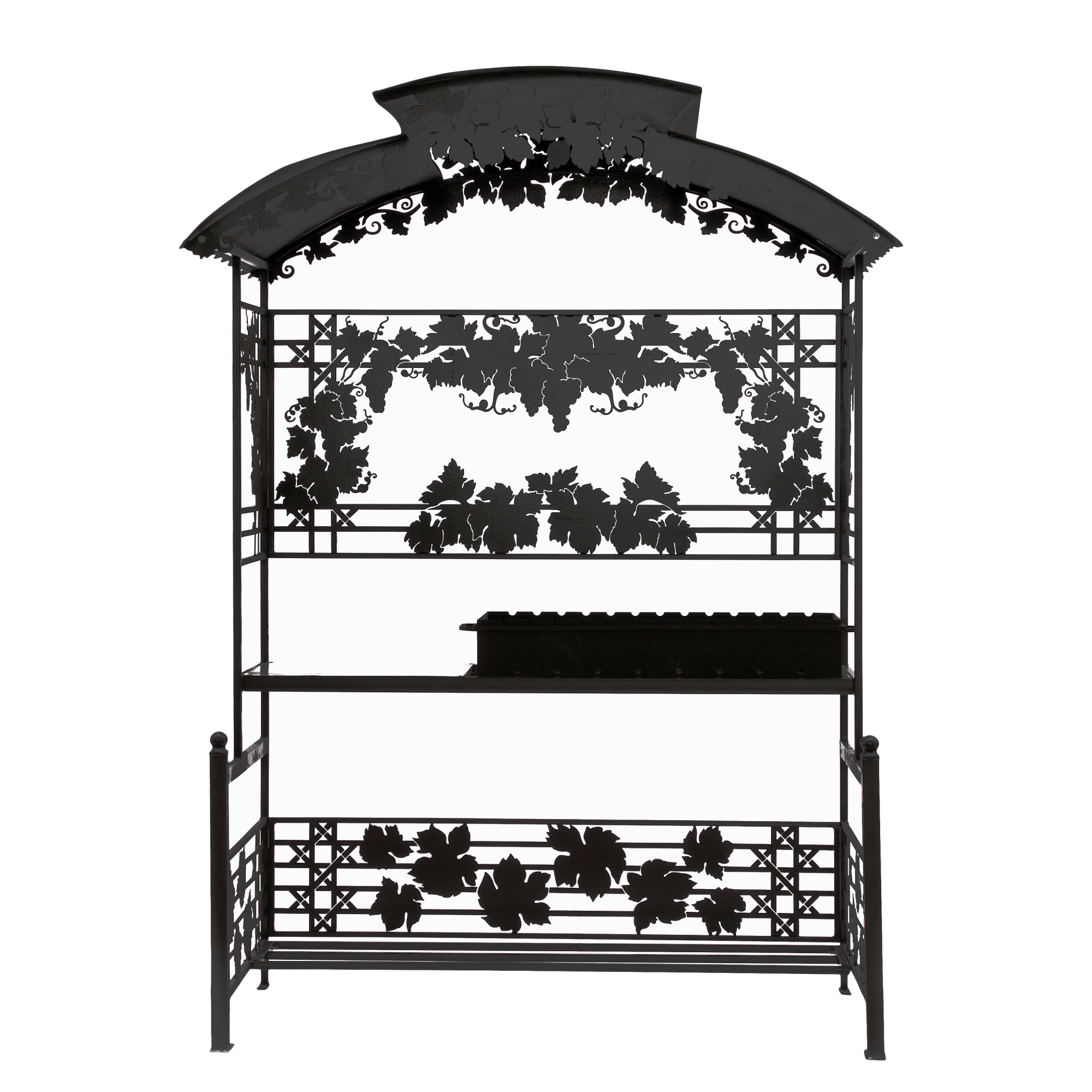 Мангал Виноград М90К (с печью под казан) - это металлический разборный мангал с крышей, с резными рисунками в виде гроздей винограда. Один из самых красивых и популярных мангалов, предлагаемых нашим производством.