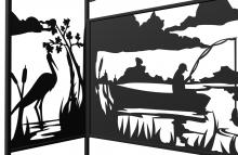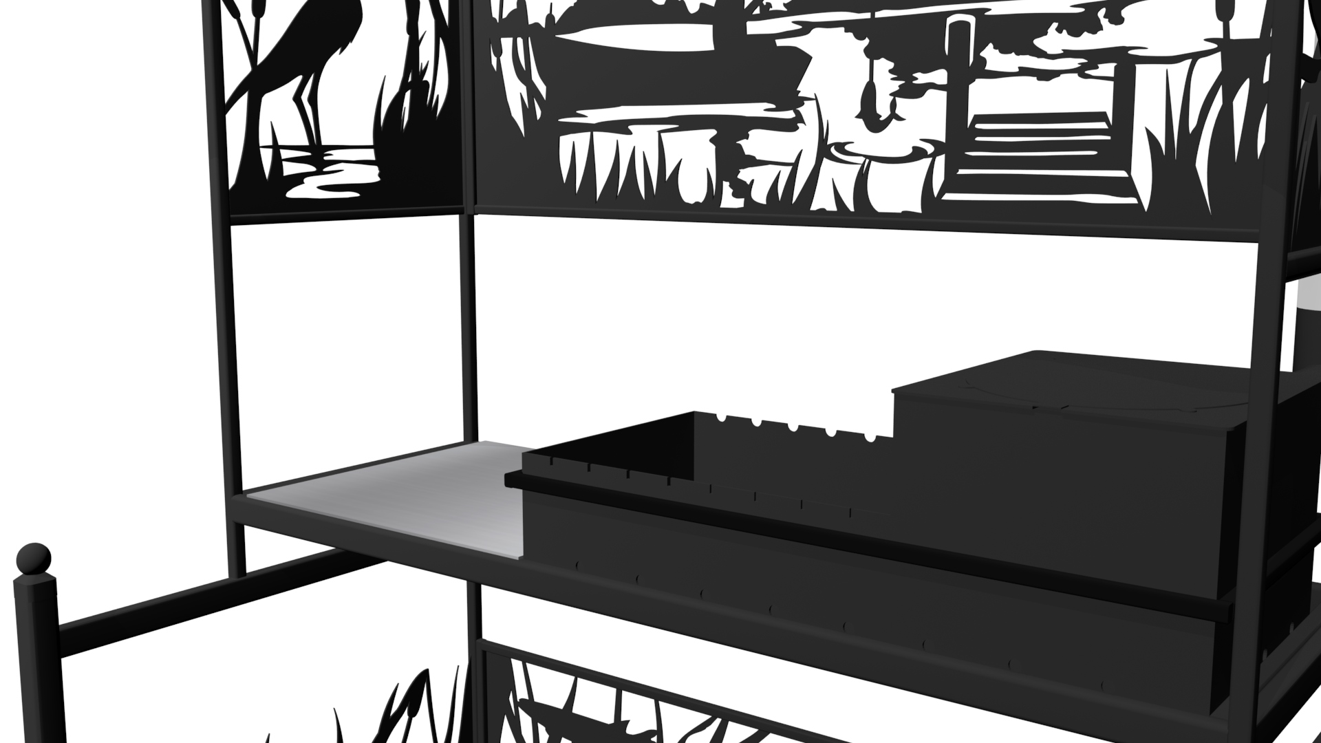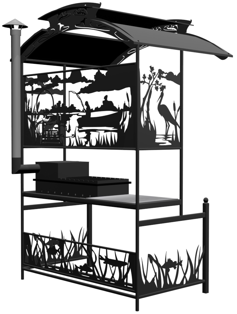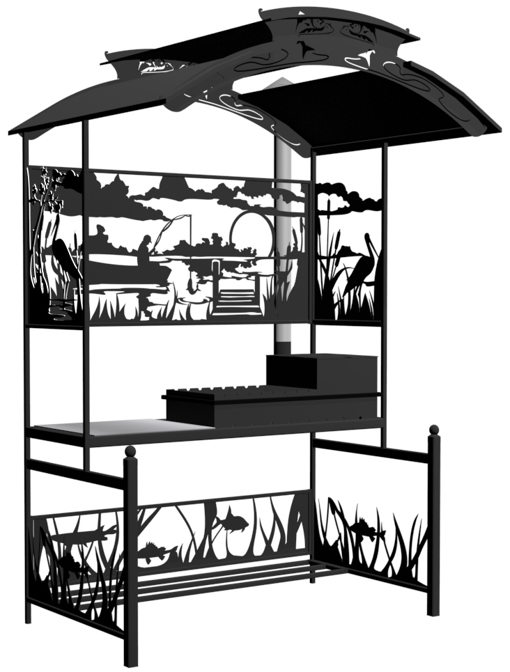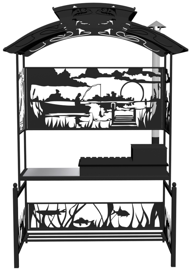 Мангал Рыбалка Казан (с печью под казан) - это металлический разборный мангал с крышей, с резными рисунками с мотивом рыбалки на тихой реке. Новинка 2019 года!