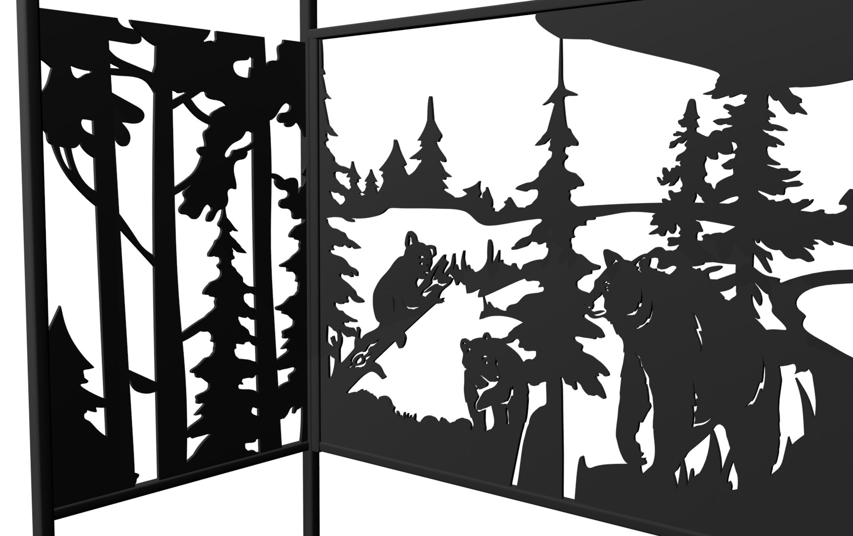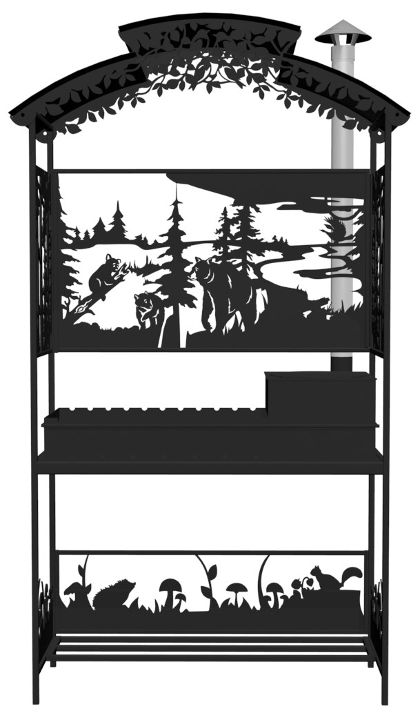 Мангал Три Медведя Лайт Казан - это металлический разборный мангал среднего размера с крышей и с резными рисунками медведей в лесу. Новинка 2019 года!