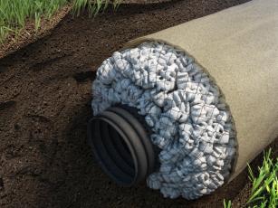 Модули дренажной системы Веллрок состоят из перфорированной дренажной трубы, внешнего фильтрующего слоя геотекстильного материала и геосинтетического наполнителя со специальными водоприемными канавками, расположенного в полости между дренажной трубой и геотекстилем.