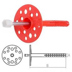 Предназначен для крепления теплоизоляционных изделий к внутренним и наружным поверхностям зданий, различного назначения, в том числе в системах вентилируемых фасадов, штукатурных фасадах, колодезной кладке. В такие основания, как тяжелый и легкий бетон, полнотелый керамический и силикатный кирпич, керамзитобетонный блок, пустотелый керамический и силикатный кирпич, блоки полнотелые из легкого бетона, ячеистый бетон (газобетон), без ограничения по высоте. За счет широкой шляпки дюбель часто называют "парашют" или тарельчатый дюбель. Конструкция широкой шляпки дюбеля плотно прижимает теплоизоляцию, отверстия позволяют утопить дюбель в клее без потери эластичности шляпки. В комплекте с дюбелем поставляется металлический оцинкованный гвоздь с термоголовкой, который имеет пластиковый колпачок, предотвращающий образование «мостика холода» и коррозии гвоздя, тем самым улучшая теплоизоляцию.
