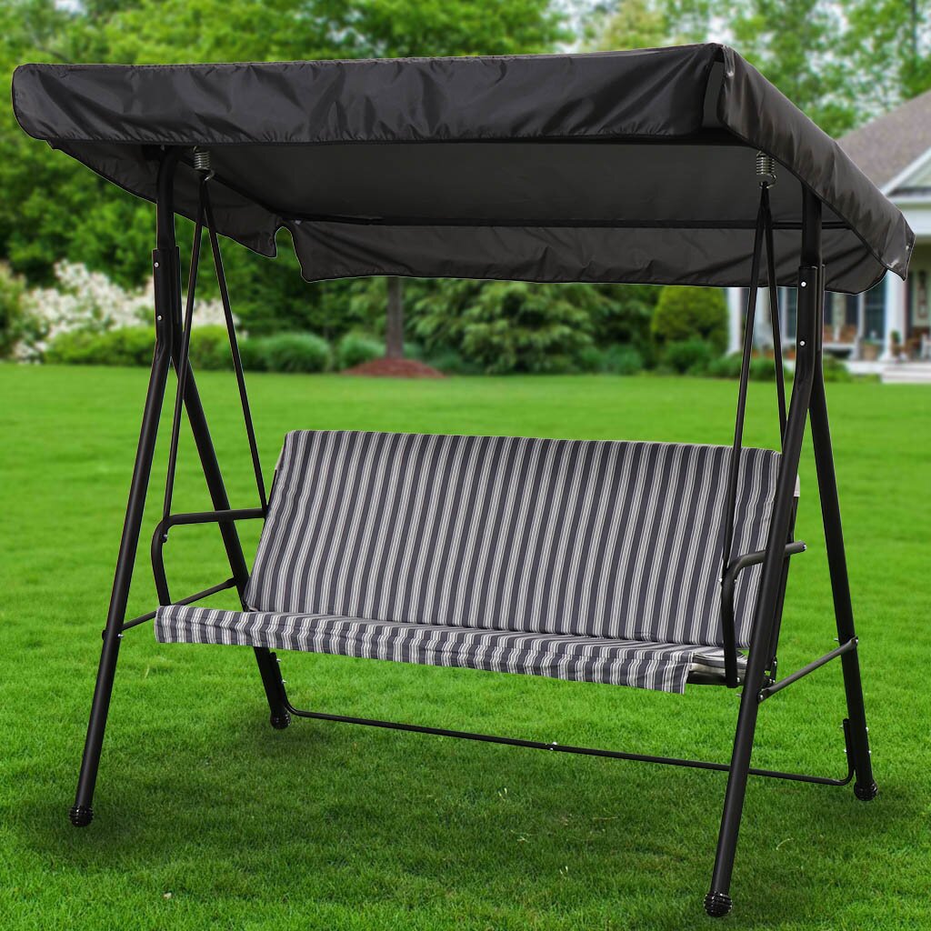 Стальной каркас - это жесткость и устойчивость конструкции, съемный мягкий матрас из полиэстера подарит комфорт в использовании. Металлические части качели защищает от коррозии эмалевое покрытие. Козырек с уклоном спасет не только от солнечного зноя, но и от слабого дождя.