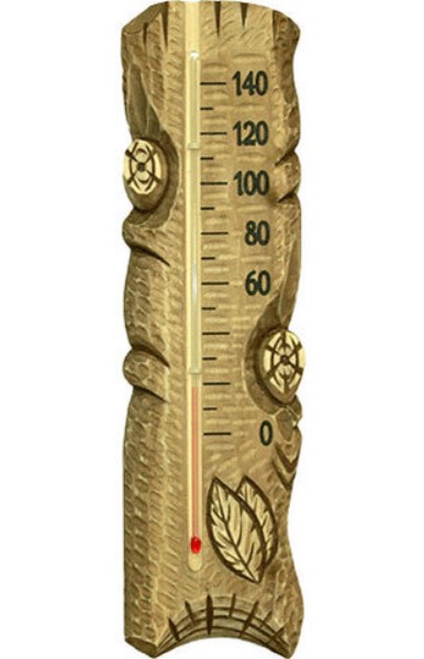 Банный термометр в оригинальном резном корпусе. Прибор для измерения и контроля температуры в парной необходим, чтобы сделать банный отдых комфортным и безопасным для здоровья, так как излишне высокая температура может привести к тепловому удару и нарушению работы сердца. Термометр — для получения более точных показаний — лучше разместить на высоте полутора метров от пола на стене, противоположной от печи.