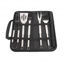 Состав: Щипцы, лопатка, вилка для гриля, щетка для гриля, кисточка для смазывания, коврик для барбекю, тканевый пенал для переноски.