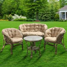 Набор садовой мебели Мальдивы включает небольшой столик с поверхностью из стекла, а также два кресла и диван.