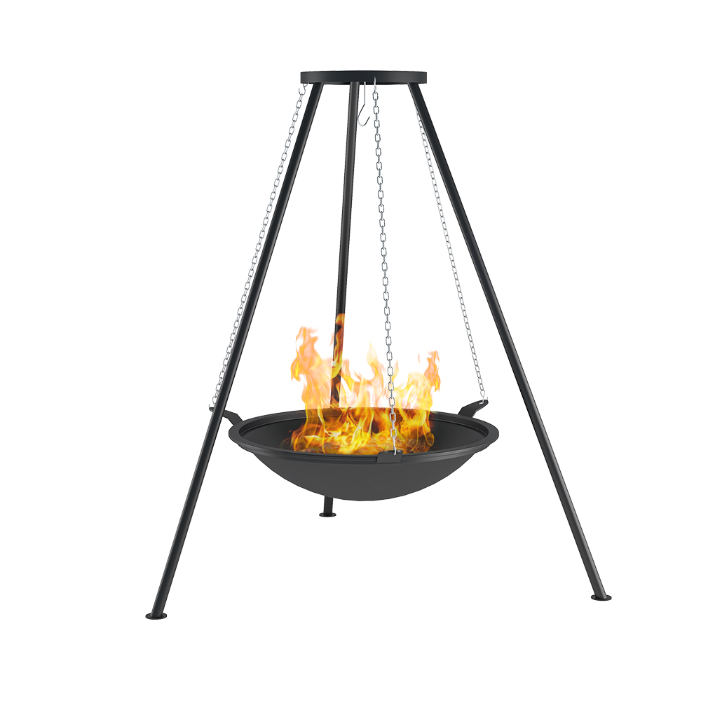 Особенность модели в том, что чугунная костровая чаша висит в воздухе и высоту ее можно регулировать.