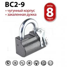 Замок навесной ВС2-9 ЧАЗ имеет степень защиты 8, что относится к уровню ультра. Замок в чугунном корпусе с закаленной ТВЧ-закалкой прямой дужкой. Диаметр дужки замка ВС2-9 14 мм. Используется для защиты дверей в магазинах, складах, гаражах.