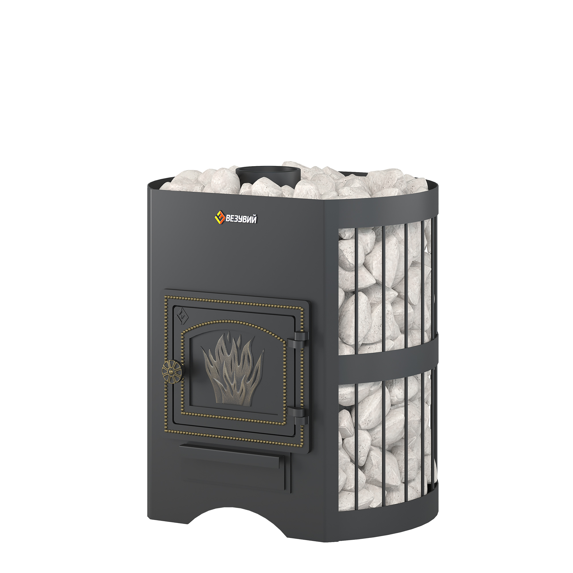 Воздух в зону горения подаётся через поддувало, его количество регулируется зольным ящиком совкового типа. Открытый зольник усиливает горение, закрытый – замедляет его. Чугунный пламегаситель перенаправляет поток горячего воздуха и дымовых газов к задней части топки. Это позволяет снять с печи максимум энергии в единицу времени. Чугунная дверь при нагревании не деформируется, сохраняет свою форму при остывании и предотвращает попадание продуктов горения на пол перед топкой. Печи Везувий СКИФ оснащаются сетками для камней. Сетки могут быть сделаны из металлического прутка или кованой стальной ленты шириной 40 мм. В сетки по всей высоте укладываются камни для бани, обеспечивая большой объём заклада и длительное удержание тепла после прогрева каменки.