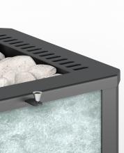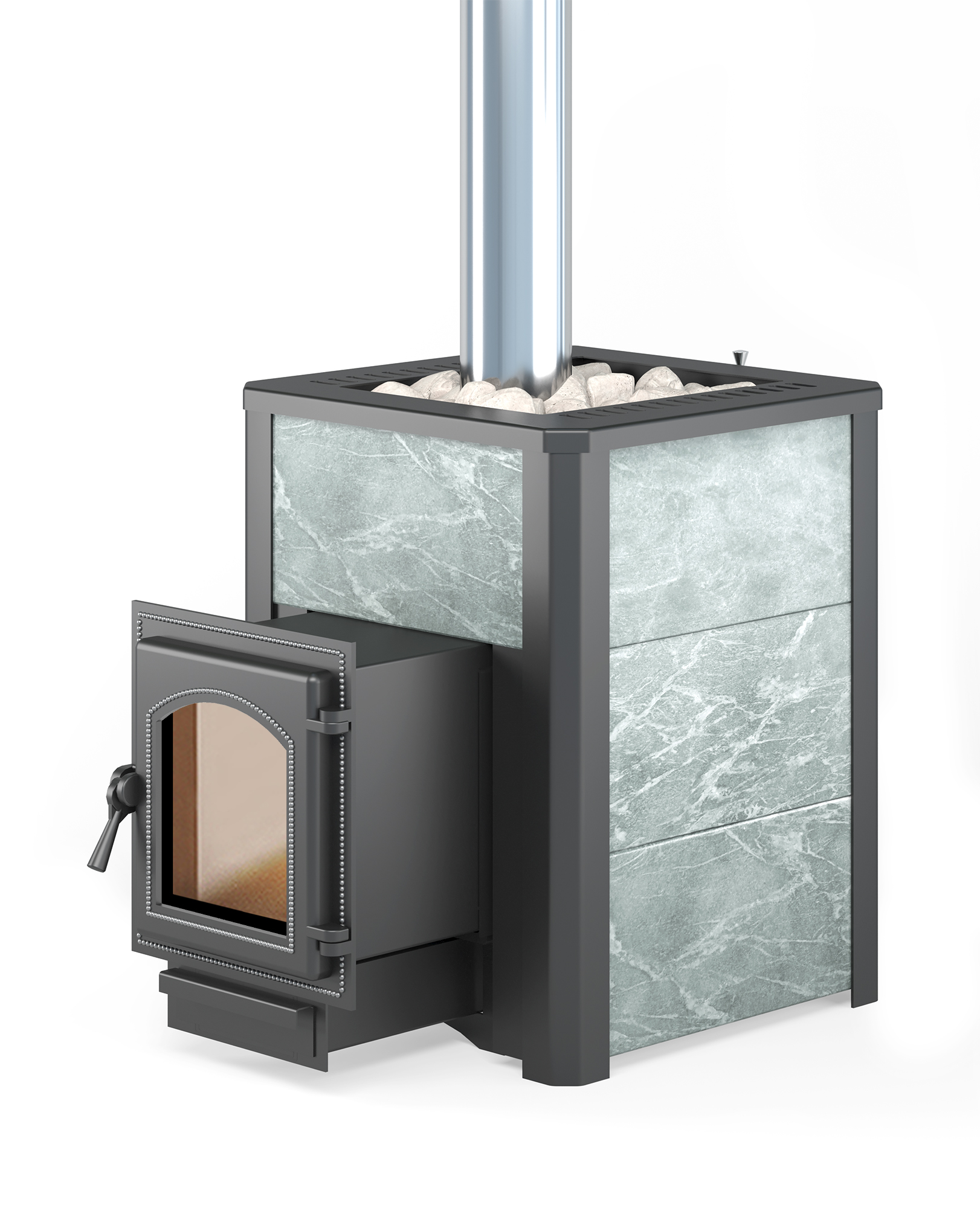 Преимущество печи в том, что топка печи состоит из 3-х ЧУГУННЫХ элементов. На стыке между ними используется керамический шнур с рабочей температурой 1200 градусов. То есть топка печи абсолютно герметична! Для фиксации деталей между собой применяется болтовое соединение, что даёт 100% гарантию безопасности при эксплуатации. Конвекционно–вентилируемая облицовка, изготовленная из экологически чистой горной породы , который обладает большой теплоёмкостью, что позволяет камню в короткие сроки нагреваться и максимально долго удерживать стабильную температуру в парильном помещении, а также гасить жёсткое инфракрасное излучение Камень обладает исключительными лечебными свойствами: помогает при головных болях, при нестабильном артериальном давлении, при простудных заболеваниях, воспалительных процессах в почках и пищеварительной системе, снимает повышенную возбудимость и нервозность, сглаживает эмоциональные всплески. Облицовка из натурального камня при нагреве способна аккумулировать тепло, что гарантирует максимально равномерный прогрев и сохранение тепла. Печь укомплектована чугунной каминной дверцей Везувий 270 с большим жаропрочным стеклом «SCHOTT ROBAX». Данная печь рассчитана на объем парильного помещения 8-18 м3.