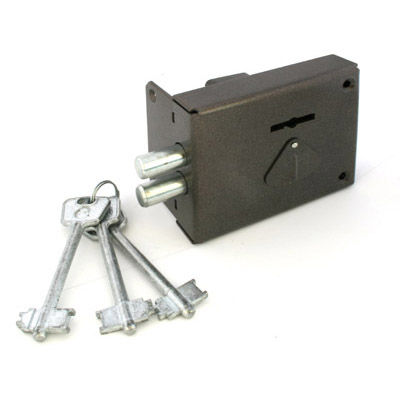 Замок накладной сувальдный. Предназначен для установки на деревянные двери. Засов из двух цилиндрических ригелей диаметром 12 мм, с максимальным вылетом 22 мм. Удаление ключевого отверстия - 55 мм. Количество полуоборотов ключа - 2. Габариты замка - 100х82х25 мм. Комплектация - 3 ключа, запорная планка, накладка.