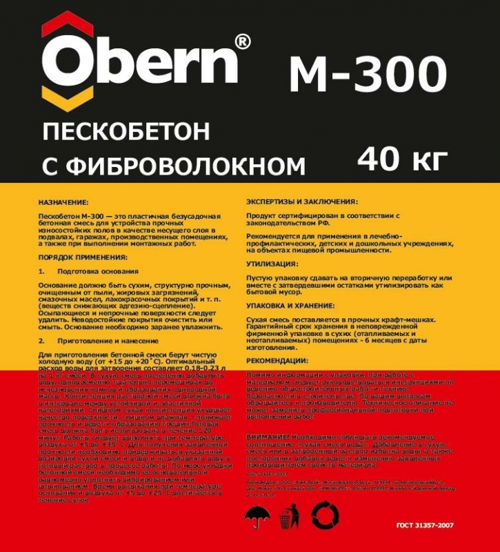 Пескобетон М300 Obern – универсальная смесь, этот материал применяется для стяжки полов, для устройства фундаментов, заделки щелей и дефектов в строительных конструкциях, а также для кладочных работ. Бетонная конструкция, выполненная из М300, выдерживает нагрузку 300 кг/см2