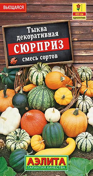 Смесь декоративных тыкв с разнообразной формой плодов. Растения длинноплетистые – главный побег достигает 4 м длины. Плоды массой 200-300 г украсят растения в августе-сентябре. Зрелые плоды собирают до наступления заморозков. Они хорошо хранятся в комнатных условиях и служат оригинальным украшением интерьера. Лианы используются для быстрого вертикального озеленения стен, высоких заборов, беседок, веранд.