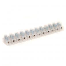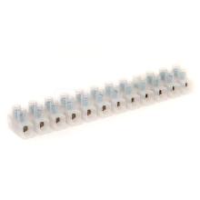 Электрический винтовой клеммник изготовлен из диэлектрического корпуса, в котором расположены латунные контактные группы с винтовыми зажимами, в количестве двенадцати штук. По мере надобности клеммную колодку возможно разрезать на требуемое число контактов.