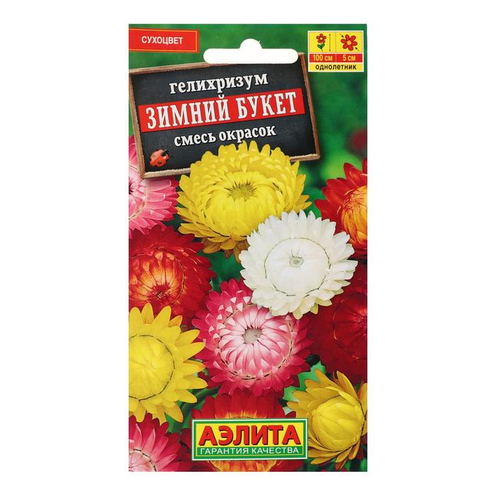 Неповторимое однолетнее растение-сухоцвет, часто именуемое цветоводами бессмертником. Смесь практически не требует ухода и отличается широкой палитрой ярких оттенков. Растения крепкие, устойчивые к непогоде, высотой до 90-100 см. Цветки особенно крупные, махровые, до 5-6 см в диаметре, с жесткими, словно шуршащими лепестками. Гелихризум – отличный выбор для клумб и настоящая находка для заготовки сухих букетов. Для этого срезают побеги со слегка распустившимися бутонами и подвешивают на пару недель цветками вниз. Форма, оттенок сохраняются до 4 лет.