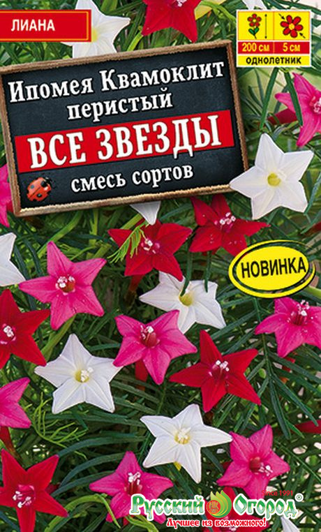 Очень эффектное и необычное вьющееся растение с изящными цветками и ажурными листьями. Популярно у садоводов и известно также как “кипарисная лиана”. Развивается быстро, взбираясь по любой опоре на высоту до 2 м. Образует яркий занавес из воздушной зелени и цветов-звездочек ? 3-5 см. Ипомея станет изысканным украшением участка, террас, беседок, шпалер и арок. Не требует особого ухода.