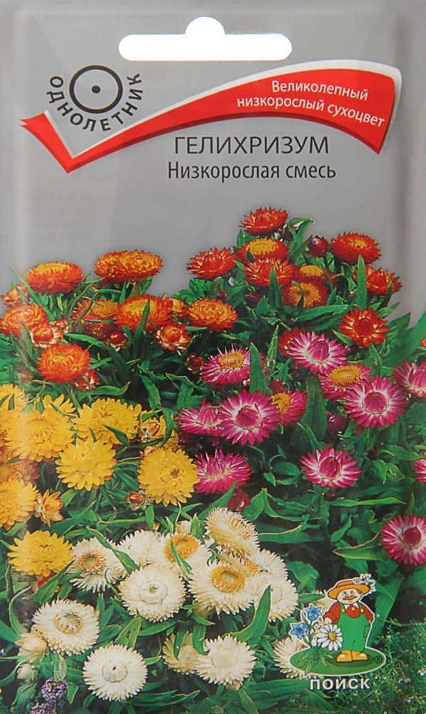 Компактное ветвистое растение высотой около 30 см. Листья ланцетные сидячие. Соцветия корзинки в ярких листочках обертках самых разнообразных окрасок. Цветет обильно с июля до заморозков. Прекрасно подходит для контейнерной культуры, используют в самых различных цветниках, как бордюрное растение. Великолепный сухоцвет, незаменим для сухих букетов.