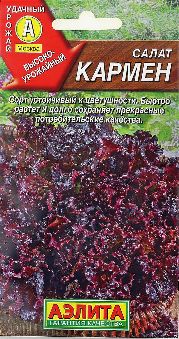 Высокоурожайный среднеспелый сорт листового салата. От всходов до начала хозяйственной годности 37-43 дня. Пригоден для весенне-летнего выращивания в открытом грунте и круглогодичного – в защищенном. Розетки листьев крупные, высотой 20-25 см, ? 25-30 cм, массой 210-270 г. Листья очень нежные, сочные и хрустящие. Вкусовые качества отличные, без горечи. Сорт отличается устойчивостью к гнилям. Урожайность 2,1-2,5 кг/м2.