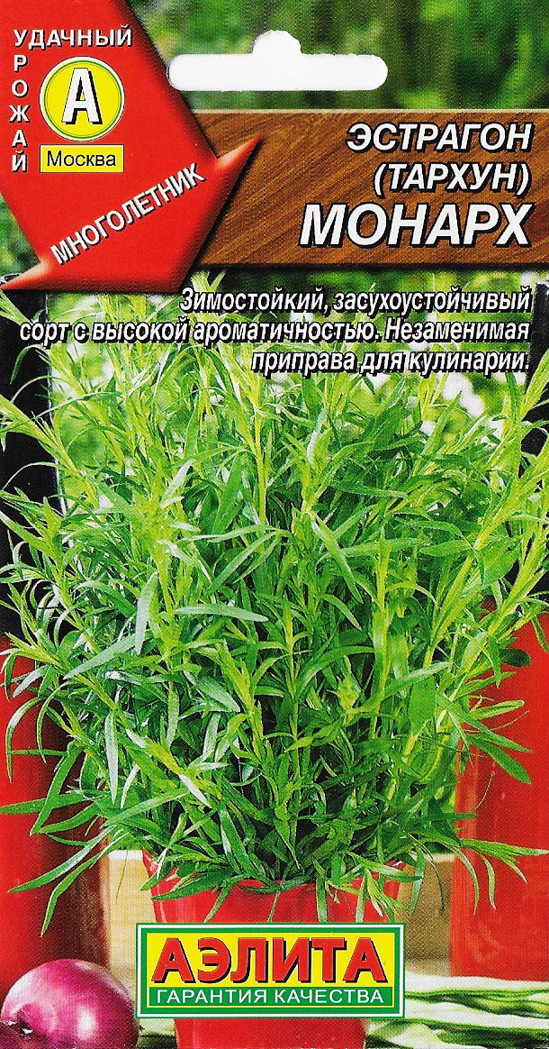 Семена Эстрагон Монарх (тархун). Зимостойкий, засухоустойчивый, ароматный многолетник из семейства полыней. Сорт формирует растения высотой до 150 см. Рекомендуется для использования листьев и молодых побегов в домашней кулинарии. Период от весеннего отрастания до первой срезки на зелень 25-30 дней, до второй срезки – 135 дней. Масса одного растения 700 г. Урожайность зеленой массы при двухразовой срезке до 5 кг/м2. Под названием «тархун» широко используется при засолке овощей, замачивании яблок, квашении капусты, для приготовления маринадов, освежающих напитков.