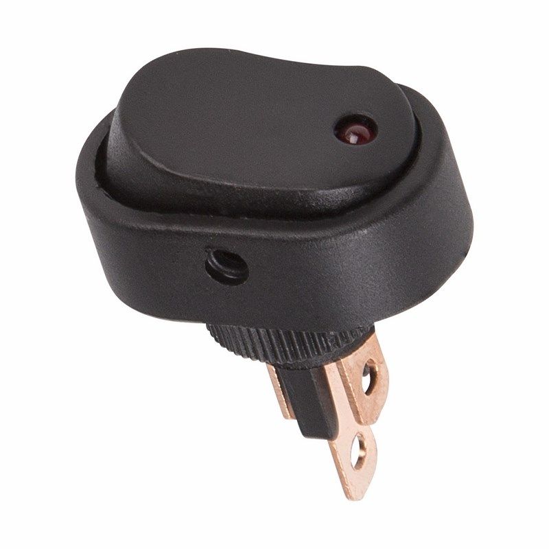 Выключатель предназначен для коммутации электрических цепей. Клавишные (Рокерные) выключатели применяются в качестве комплектующих изделий различного электрооборудования (аудио оборудовании, блоках питания, электроустановках на различных производствах, автомобилях, и многих других местах), с напряжением не более 12В. Такой переключатель имеет два положения и специфическую овальную форму клавиши. Монтаж осуществляется без применения винтов на плоских панелях толщиной от 0.8мм до 3мм в круглом отверстии. Подключение контактов осуществляется плоской клеммой, либо с помощью пайки.