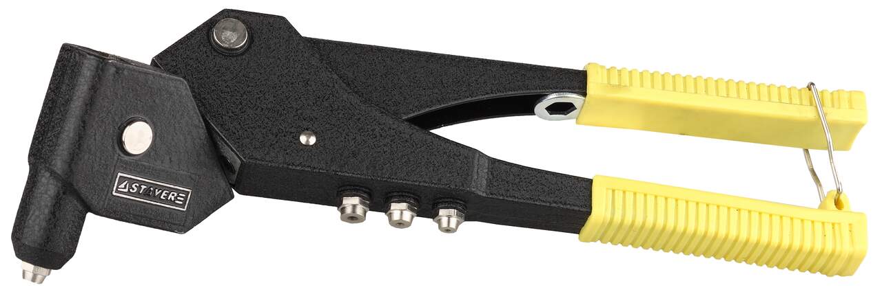 Заклепочник STAYER 3107 используется для получения неразъемных соединений. Данный инструмент может работать с разными видами заклепок от 2,4 мм до 4,8 мм. Клепательные насадки и ключ для их замены крепятся на ручке заклепочника, что позволяет находиться инструменту всегда под рукой. Заклепочник выполнен из металла, что говорит о его прочности и надежности.