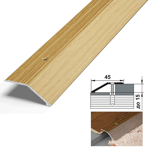Профиль шириной 45 мм с тремя желобками. Допустимый уровень перепада до 15 мм. Предназначен для декоративной стыковки любых двух разноуровневых поверхностей.
